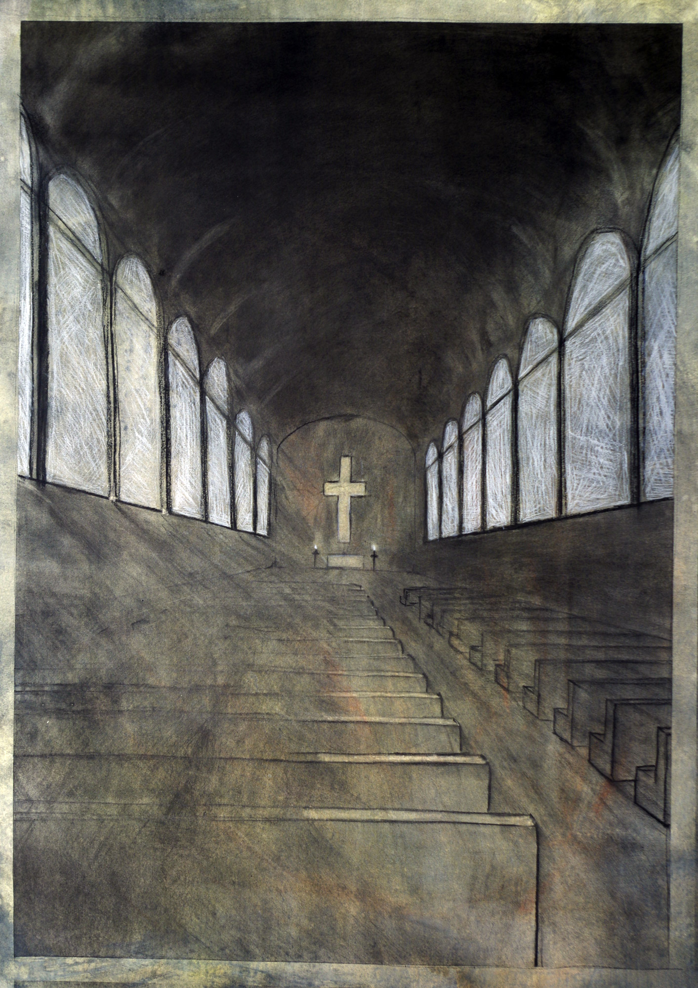- The pews are constructed using no ruler. Notice how each pew is in perspective and appear to be correctly sized and spaced as they recede to the front of the Cathedral? This was pretty difficult with willow charcoal. As with other religious images, the vanishing point is on the cross. (I of course, could have chosen not to do this, and ended up with a less believable drawing. The choice of vanishing point is what makes it a church!)