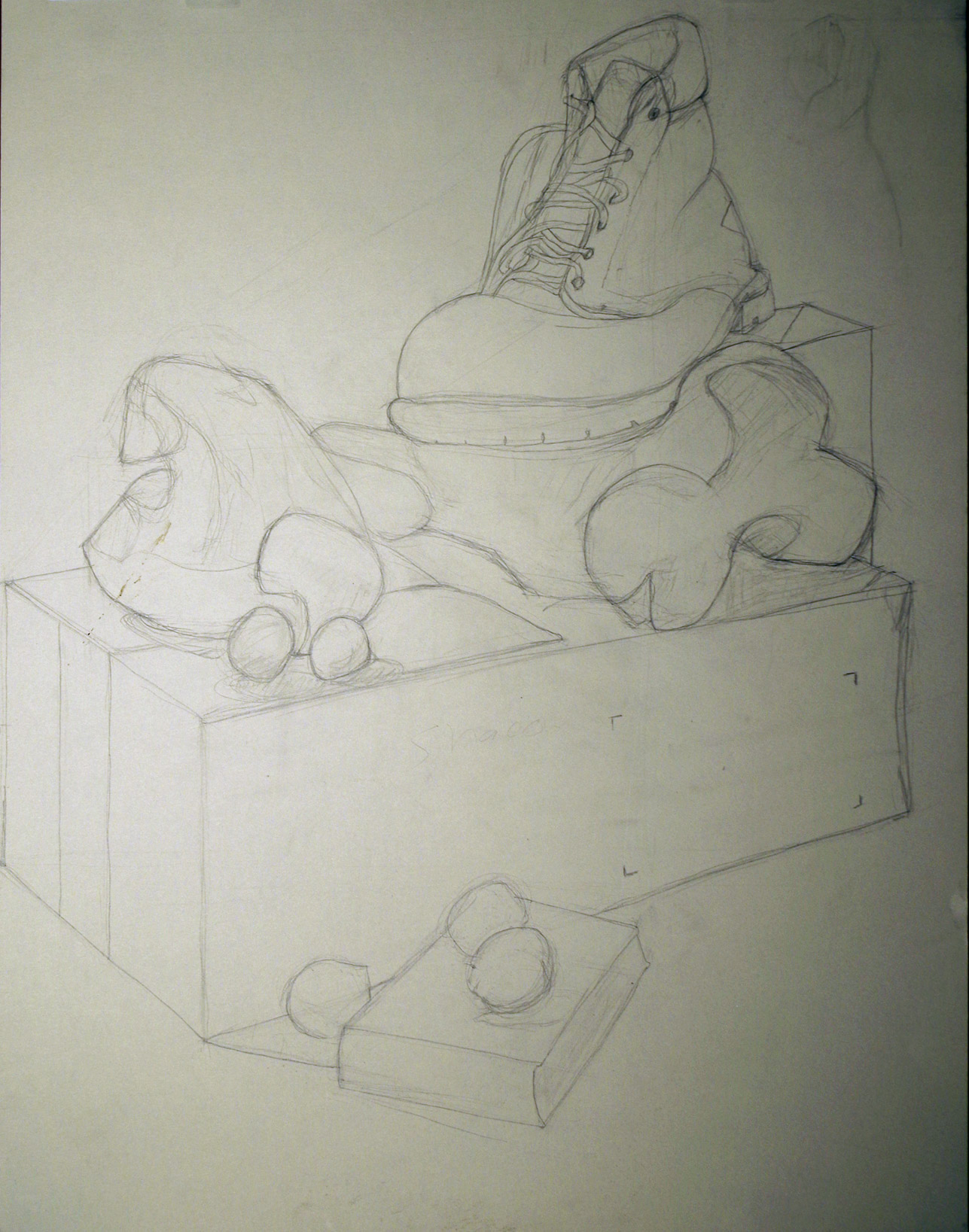 This was the last in class assignment. The approach here is pretty cool. First, draw using a pencil the still life on white paper. Next, apply copious amounts of charcoal to the back of the paper. Then, with the charcoal side pressed to the toned paper, re trace the drawing. This is literally a carbon copy. The advantage here is that the pencil is easier to get the lines in place. Interestingly though, lines were forbidden in the final drawing (no hard edges!). The completed drawing is done entirely with value. I liked the shoe the most, so I made it the focal point of the image. Random things: