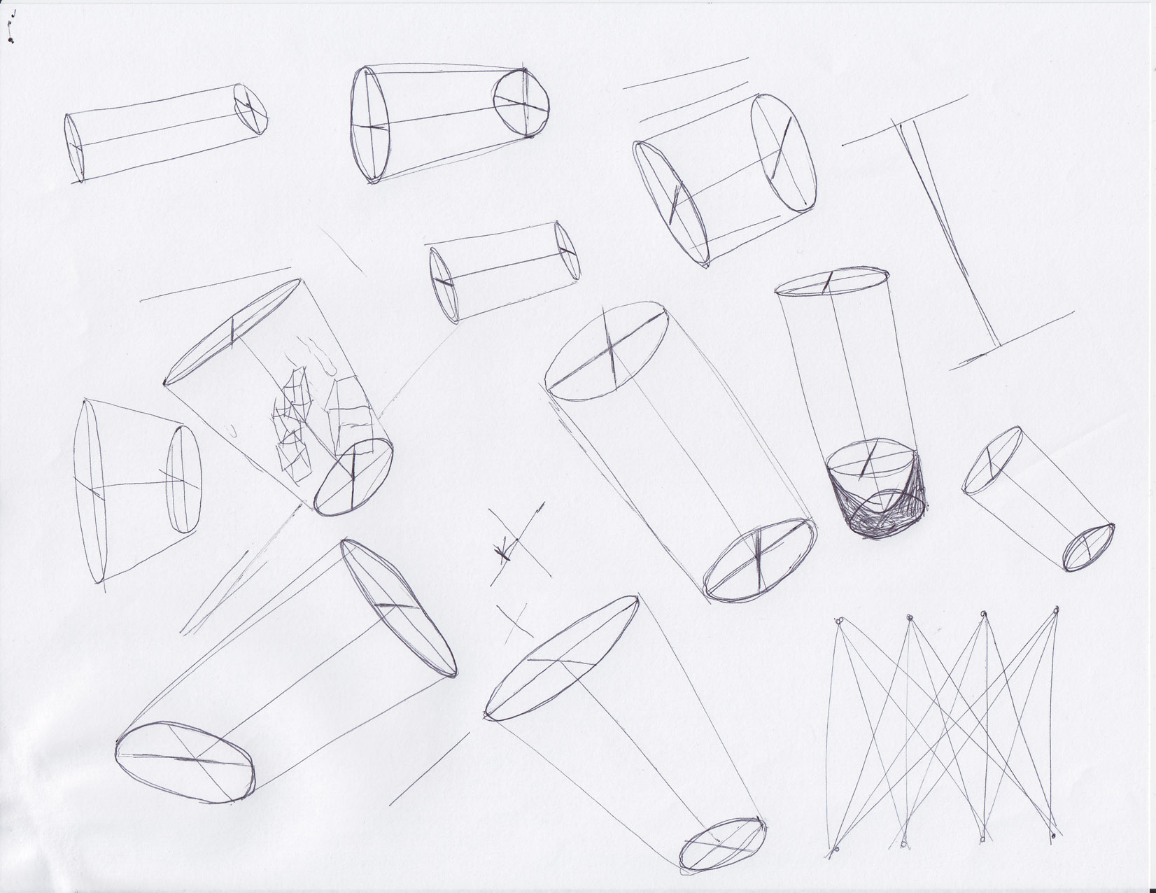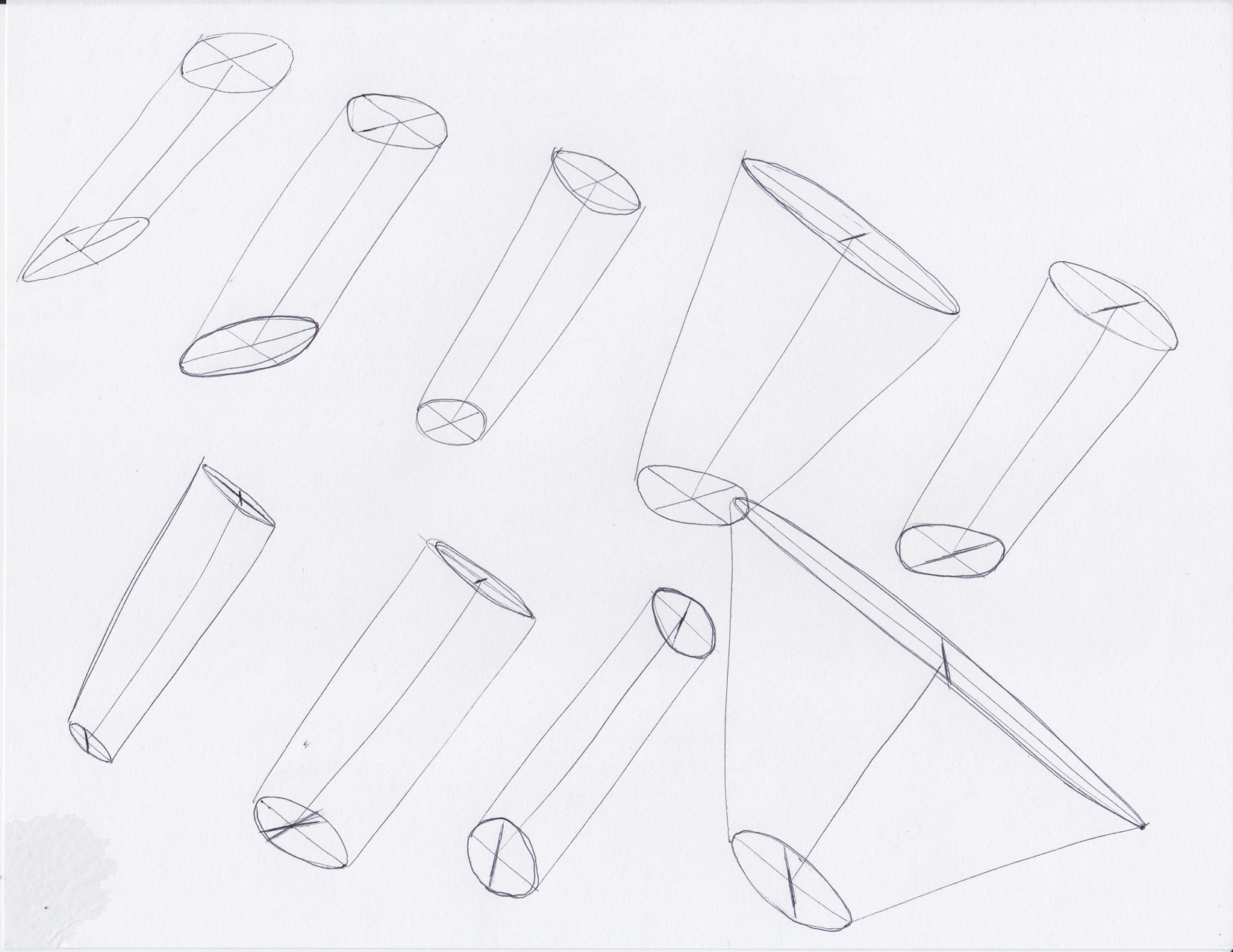 I missed out on drawing yesterday because I jammed my thumb playing volleyball, but today I attempted to draw some cylinders. Cylinders combine both ellipses (circles in perspective) and lines. The approach I took at first was to draw two ellipses first and connect the lines, but that results in shapes that look wrong. Next, I tried drawing the three axes of the cylinder, and then filling in the ellipses around those.